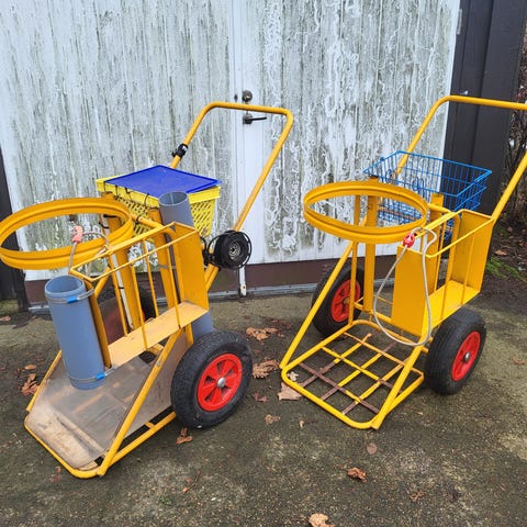 Vagnen rullar lätt och smidigt på fyra gummihjul. Den är tillverkad av svart kraftigtt tyg. Och metallstomme.