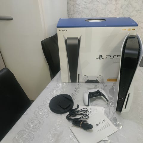 Playstation 5 spelkonsol med svart och vit design. Inkluderar en svart handkontroll. Enheten har en modern design med ventilationsöppningar för kylning.