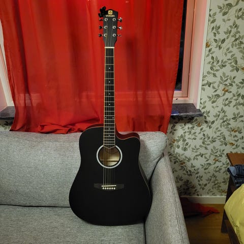 Stagg A2006-BLS (Blue Sunburst). Det är en elektroakustisk gitarr med grund kropp (shallow bowl) och cutaway-design.