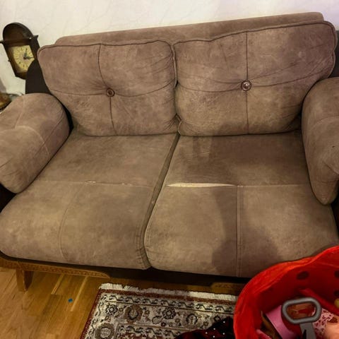 Soffgruppen är 85 cm hög o 100cm djup o sitthöjd ca 45 cm. Lejongul till färgen.