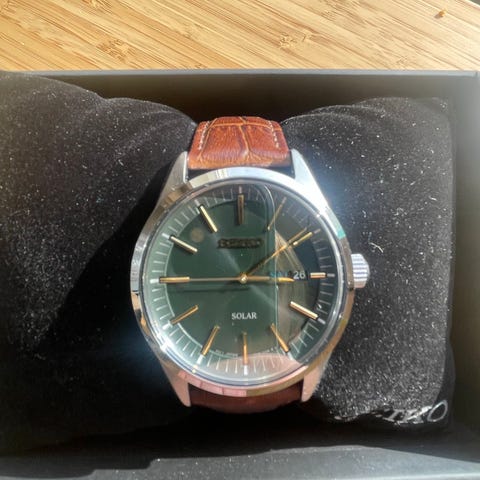 Seiko herrklocka med rund urtavla och datumvisning. Klockan har en guldfärgad boett och svart textilarmband.