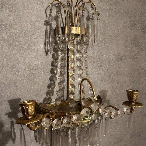 Sökord: vägglampett, prismor, prismalampa, vägglampa, mässing, kristallglas, vintage, retro, 40-tal, 50-tal, klassisk belysning