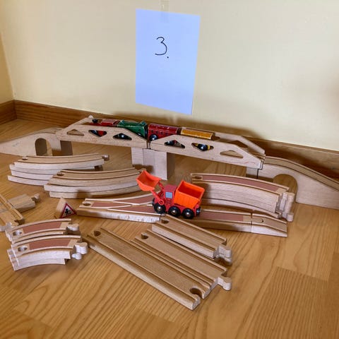 Stadig dubbelhängbro från BRIO (33683). Om den kombineras med ytterligare två påfartsskenor (måste köpas separat) kan den byggas om till två kortare hängbroar istället för en lång.