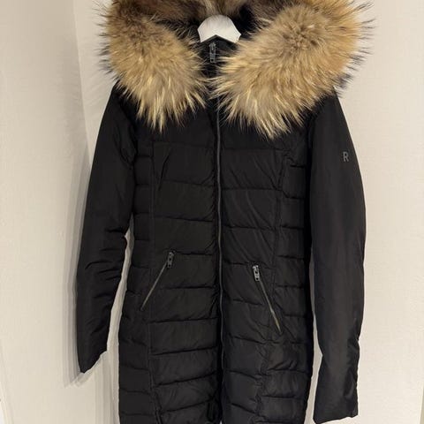 En snygg och figursydd svart vinterjacka med quiltade detaljer som ger ett stilrent uttryck. Jackan har en avtagbar huva med fluffig, ljus fuskpäls som ger både värme och en elegant touch. Den är utrustad med flera praktiska fickor med dragkedja fram, samt dubbelknäppning med både dragkedja och tryckknappar för extra skydd mot kyla och vind. Perfekt för den som vill ha en varm, lätt och bekväm vardagsjacka med feminin passform. Jackan är äkta