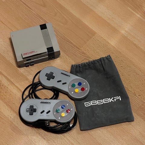 Nintendo Switch med två extra handkontroller och en laddare för fyra handkontroller.