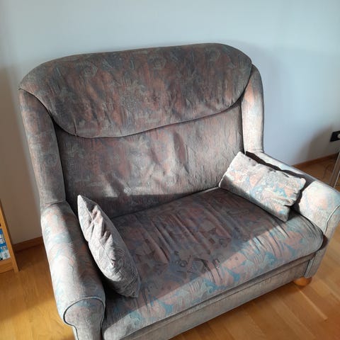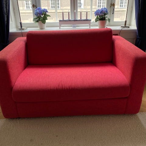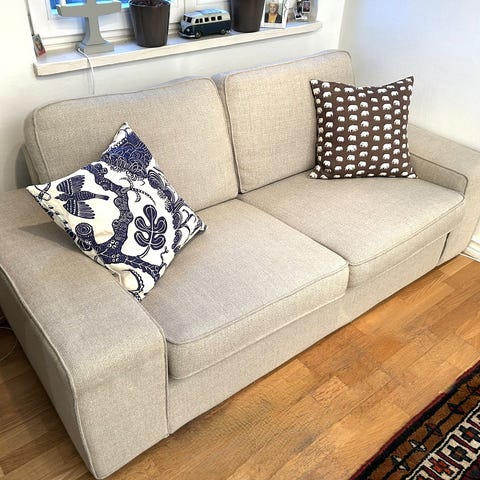 Tvåsitssoffa i vitt tyg med avtagbar klädsel. Soffan har raka armstöd och en enkel design. Passar för vardagsrum eller mindre utrymmen där en kompakt soffa önskas.