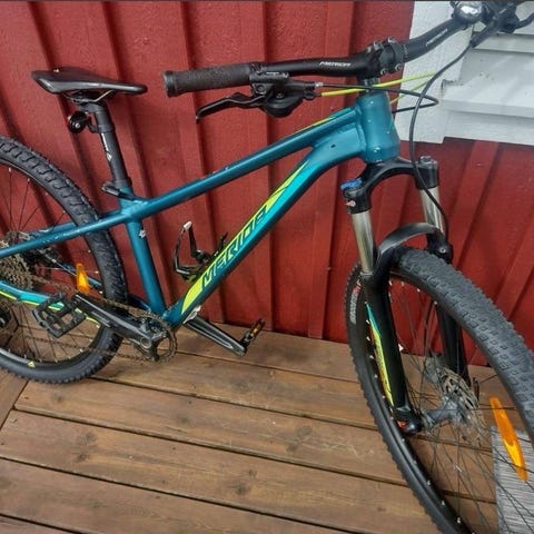 24 tum, 3 växlar. Handbroms fram och bak samt fotbroms. Använd i cirka 3 år och fungerar bra. Normalt slitage. Passar för ca 7-11 års ålder / 125-140 cm längd