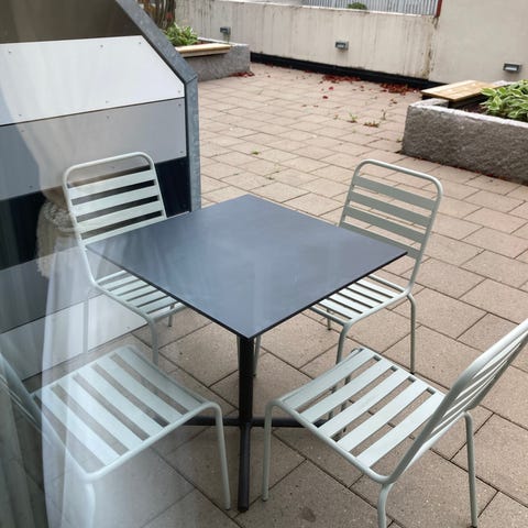 Bordet är gjort av frosttåliga klinkerplattor och passar bra som utebord.