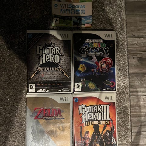 The Legend of Zelda Wii U spel med tre titlar: The Legend of Zelda: Twilight Princess HD, The Legend of Zelda: Breath of the Wild, och The Legend of Zelda: The Wind Waker HD. Spelen är för Wii U-konsolen och innehåller spelskivor och fodral.