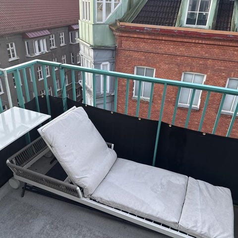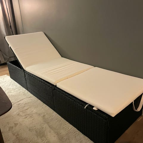 Solsäng för utomhusbruk med svart rottingram och grå dyna.