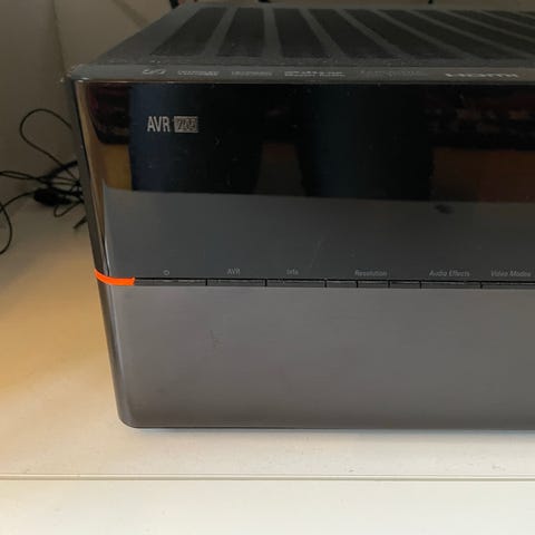 Harman Kardon Receiver med olika anslutningar för ljudsystem. Enheten har en svart finish och är avsedd för hemmabruk.