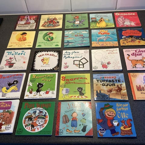 16 pixi böcker. En samling barnböcker med olika titlar och författare. Böckerna är avsedda för barn. Innehåller illustrationer och berättelser anpassade för yngre läsare.