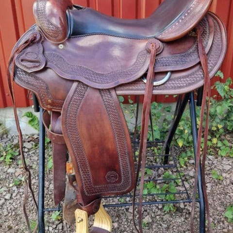 En mycket fin Western sadel med sadelväskor, brösta, sadelgjord och bakgjord. Mått ca 65 cm lång. Ca 53 cm från ytterkant framvalv till bakvalv sittdelen. Upplevs rätt stor och ligger säkert bäst på en stor och kraftig häst. Bilder kan skickas vid intresse. Kan mötas upp längs vägen mellan Vetlanda och Stockholm.