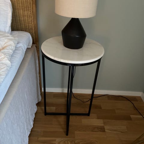 Ett sängbord/sidobord från Mio. Modellen heter Parga. Marmorskiva och glashylla under.