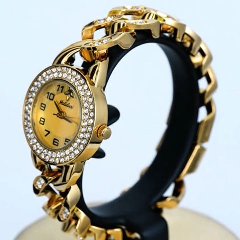 Säljer två guldfärgade damklockor. Båda klockorna har strassdetaljer runt urtavlan och på armbandet. Perfekt för den som vill ha en glammig accessoar.