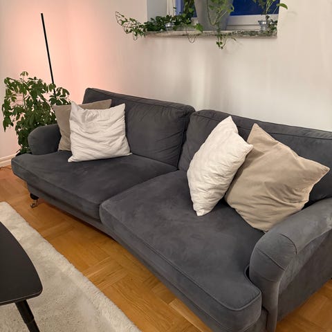 3-sits Oxfordsoffa, mörkgrå i bra skick. Men vi var kattvakter i två dagar och tyvärr så gjorde den några märken på ena sidan. Inget som stör, men därav priset. Den ena bilden visar några små märken. Säljes pga flytt och en snabb affär uppskattas.