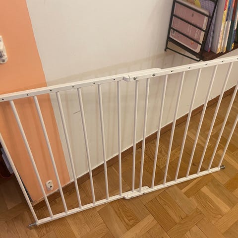 BabyDan barnsäkerhetsgrind i vitt. Grind för att skapa en säker miljö för barn genom att begränsa tillgång till trappor eller andra områden i hemmet. Tillverkad i vit metall, fint skick!