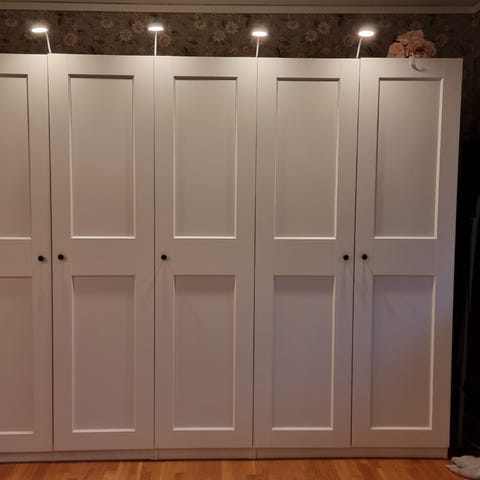 Har en paxgarderob över. I stort sett samma kombo som på bilden. Den är nedplockad och det finns ingen baksida eftersom den går sönder när man tar isär gardoroben. Antingen kan man beställa ny från ikeas reservdelar eller så skickar jag med en masonitskiva som jag själv använt till de andra.