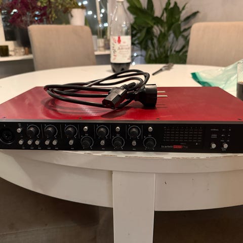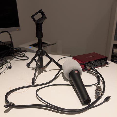 Blue ember kondensor mikrofon, Focusrite Scarlett Solo 3rd version, 3m XLR kabel och en oöppnad 2m XLR trådad kabel (hane till hona), stativ och en extra mikrofonklämma.