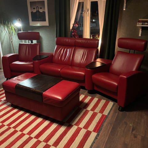 Säljer nu en riktigt bekväm och stilren soffgrupp med reclinerfunktion, bestående av: