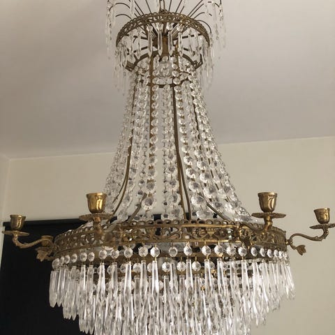 Gediget hantverk, helt handgjord med handslipade och handknutna kristallprismor och gedigen mässing stomme med fin patina. I fint skick runt om, komplett och allt fungerar. Klar att hänga upp i taket.