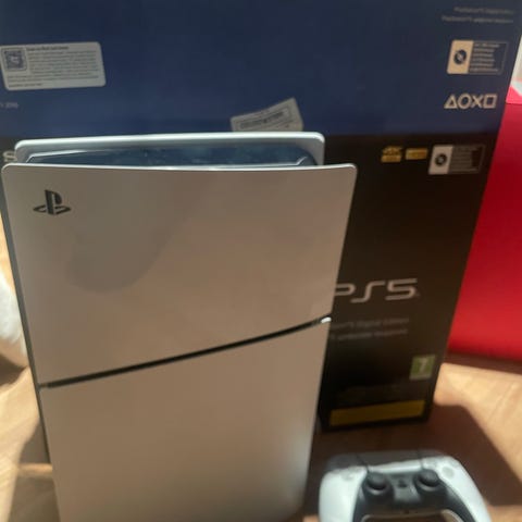 Playstation 5 spelkonsol med vit och svart design. Konsolen är avsedd för spel och underhållning. En kontroll ingår