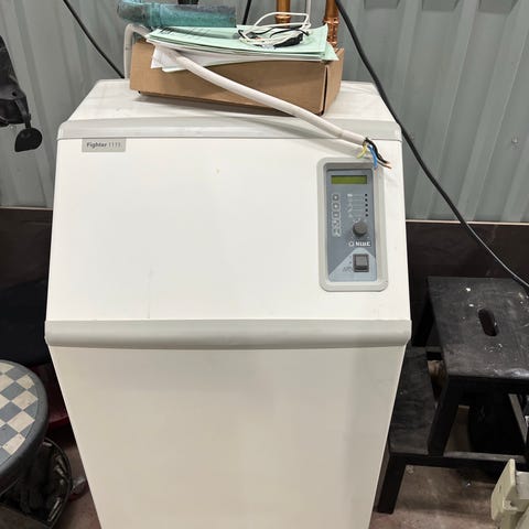 Nibe Fighter 310P värmepump med effekt på 11 kW. Utrustad med cirkulationspump och styrsystem. Används för uppvärmning och varmvattenproduktion i bostäder.