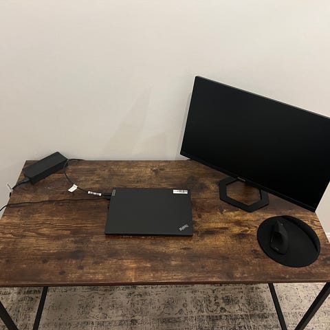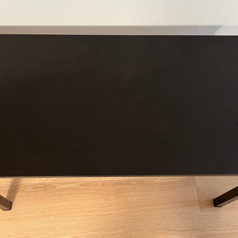 Desk made out of black painted wood plank (150x70) an red metal feet (70cm high) from ikea