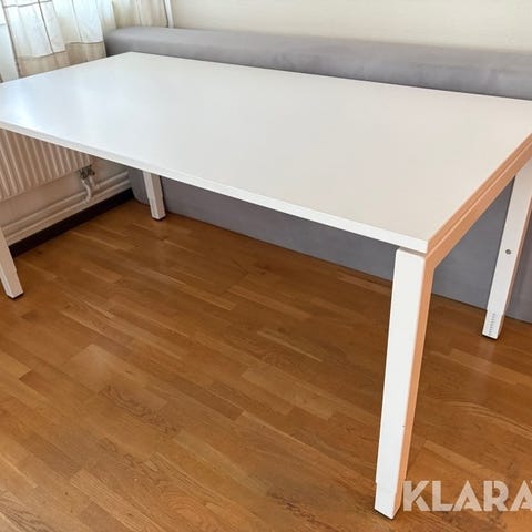 Skrivbord i trä med två sidor av hurtsar som går att flytta på har hjul, totalt sex lådor. Bordsskiva i trä med en extra utdragbar del. Färgen är teakliknande. Passar för kontors- eller hemmabruk.