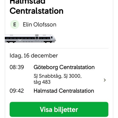 Biljett för resa från Halmstad Centralstation (Öresundsgatan, tåg 1050) till Göteborg Centralstation. Avgångstid 12:53, ankomsttid 14:05. Resan sker med annan operatör.