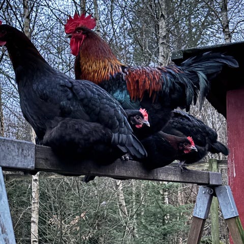 Förra sommaren kläckte jag inköpta avelsägg av Wyandotte, men det är inte rätt ras för mig så nu hoppas jag att de kan hitta ett nytt bra hem. Det är 3 hönor och 1 tupp, kläckta slutet av augusti 2024. Alla hönorna ruvade varsin kull nu i somras och har varit duktiga mammor. En av dem har kommit igång med att värpa igen efter vintern, hennes systrar är på gång. Säljes enbart tillsammans.