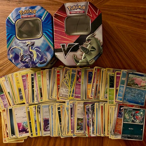 Pokémon Trading Card Game med olika kort som visar karaktärer och attacker från Pokémon-universumet. Kortens specifika detaljer inkluderar illustrationer av Pokémon och deras förmågor samt energikostnader för attacker.