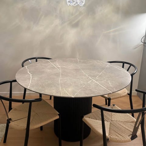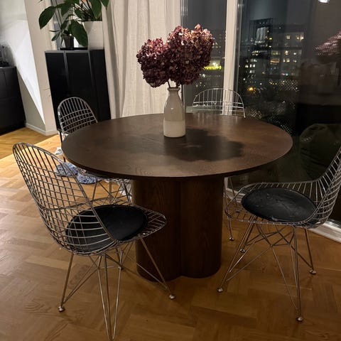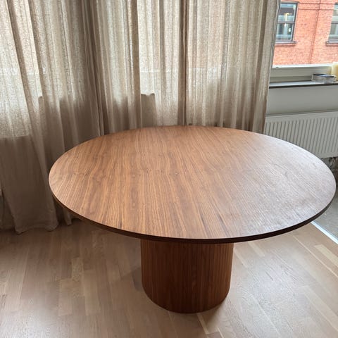 Runt matbord från sleepo, modell Adele Valnöt ø130. Gott använt skick, köpt i november 2021, säljs pga flytt. Pris vid köp: 8796 kr.