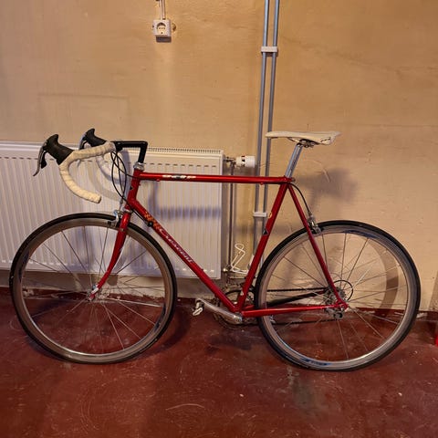 Crescent landsvägscykel för man. Cykeln har en ram i metall och är utrustad med standardkomponenter för landsvägscykling.