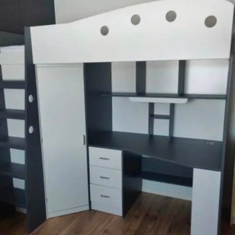 IKEA loftsäng i mörk färg med stege och sängräcken. Passar för barn och erbjuder en upphöjd sovplats med utrymme under för lek eller förvaring. Bäddmått 90 x 200. Madrass ingår inte. Sidoskydden på långsidan lutar lite utåt, se bilder.