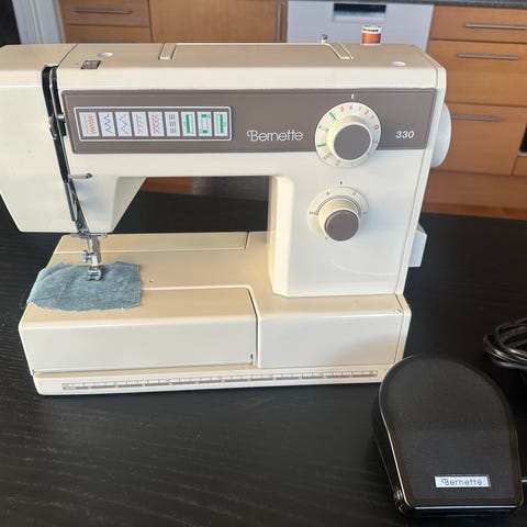 Samba Exclusive symaskin med inbyggd trådare och justerbar sömlängd. Maskinen är beige med gula och bruna detaljer. Utrustad med strömkabel och fotpedal.