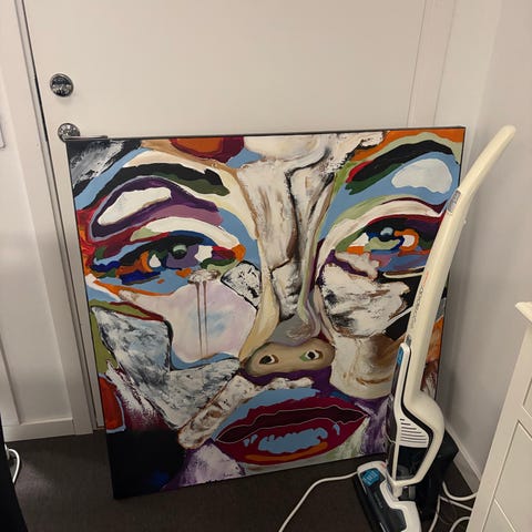 Abstrakt konstverk i färgstark stil, avsett för väggupphängning. Målad på duk med olika färger och former, lämplig för inomhusmiljö.