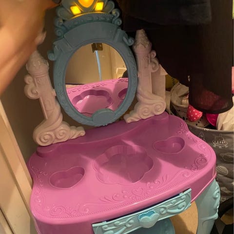 Alice & Fox Sminkbord för barn i trä. Bordet har en spegel och en låda för förvaring. Finns tillhörande pall. Bordet är använt så finns tecken på det med är fullt fungerande