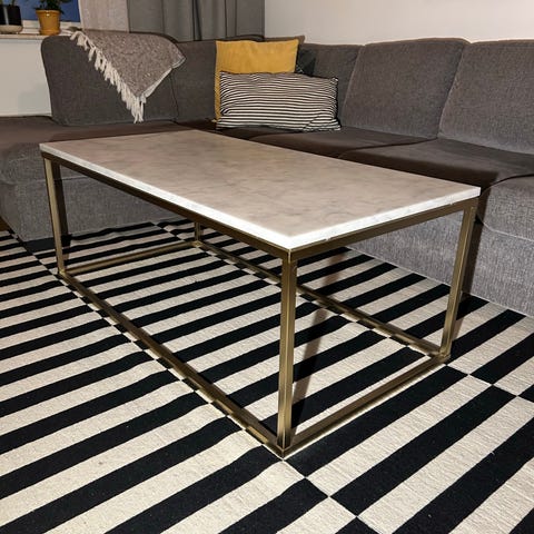 Jättefint soffbord med svart glasskiva och 2 fina marmor-ben.