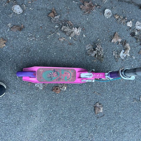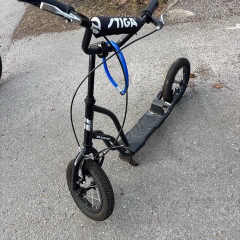 Stiga sparkcykel i rosa färg med svart väska fäst vid styret. Sparkcykeln har tre hjul för stabilitet och är anpassad för barn.