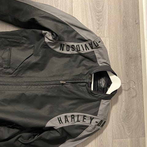 Svart skinnjacka med Harley-Davidson logga på ryggen och framsidan. Jackan har flera fickor med dragkedja och perforerade detaljer. 2 innerfickor. Nypris 6000kr. Mycket fin!