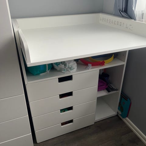 IKEA barnmöbler bestående av ett vitt bord med träkant och två vita stolar med trädetaljer samt en grå fåtölj. Möblerna är anpassade för barn och passar för lek och måltider.
