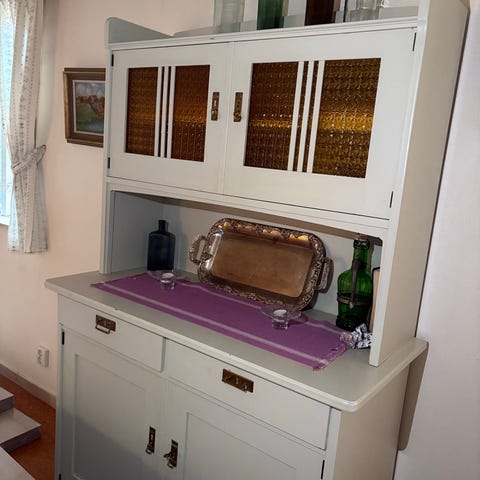 I grunden är delarna från IKEA. Sedan är möbeln målad i en mörkgrå kulör samt lackerad. Nya ben och dörrknoppar.