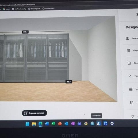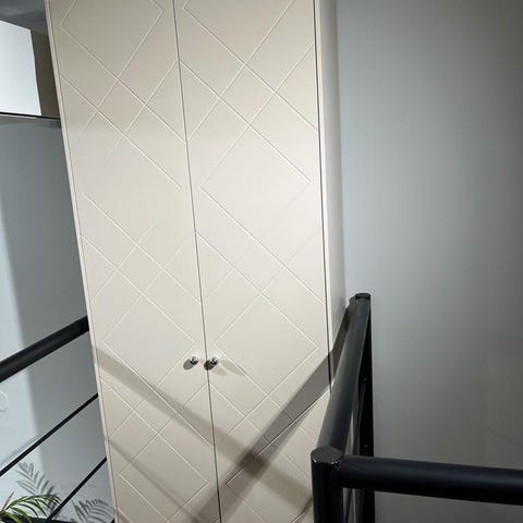 Inredening är klädstänger, skohylla, och förvarigslådor.