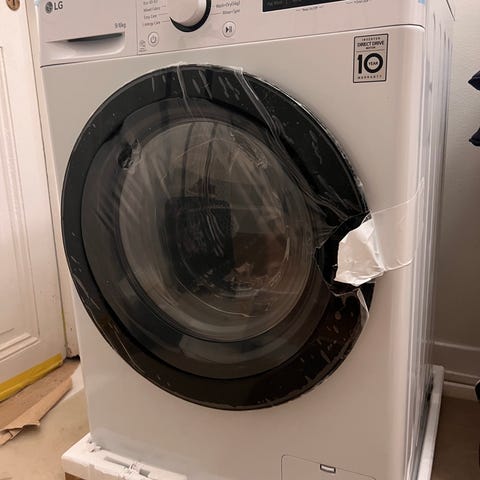 LG kombinerad tvättmaskin och torktumlare. Maskinen är avsedd för tvätt och torkning i en enhet, vilket sparar utrymme och tid. Den har en frontmatad design med en stor lucka för enkel påfyllning och tömning av tvätt. Passar för hemmabruk och kan hantera olika typer av textilier.