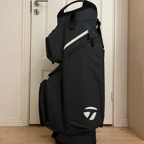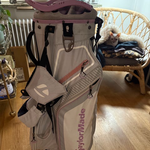 TaylorMade golfbag i vitt och blått. Utrustad med flera fack för förvaring av golfklubbor och tillbehör.