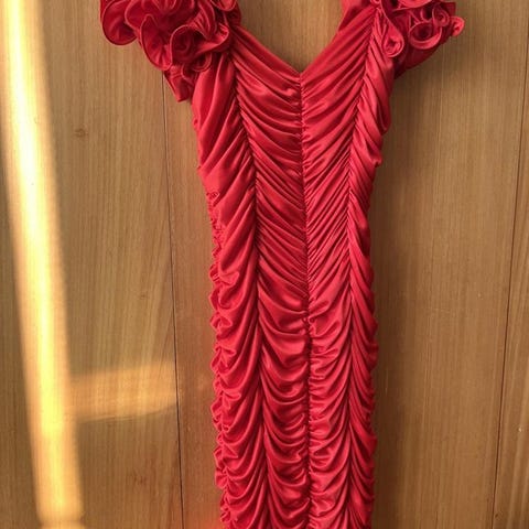 En vacker Vintage klänning i en djup röd färg. Den har ett elegant snitt med tunna axelband och en lätt A-linjeform. Storlek M-L . Viskos. Så fin och i mycket fint skick! Vintage. Är storlek 36-38 och på mig loose fit.