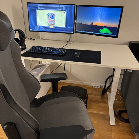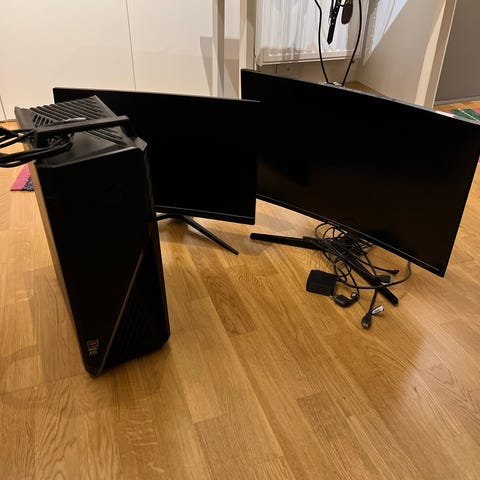HP stationär dator inklusive bildskärm, tangentbord och mus. Datorn är svart och levereras med tillhörande tillbehör för användning vid skrivbord. Bildskärmen är en separat enhet ansluten till datorn. Komplett setup för kontors- eller hemmabruk. Både stol och bord följer med i priset och kan hämtas i Stocholm för avhämtning. Detta är en HP pavilion gaming desktop TG01-2xxx. 11th gen. Grafikkort är 12 GB, lagring är 954 och ram-minne är 16,0 GB. Allt kommer tillsammans i det pris jag lägger. Perfekt julklapp! Sen är stolen från piranha men den är detekterad på baksida och bordet är från building Champions. Kan gå ner i pris vid snabb affär