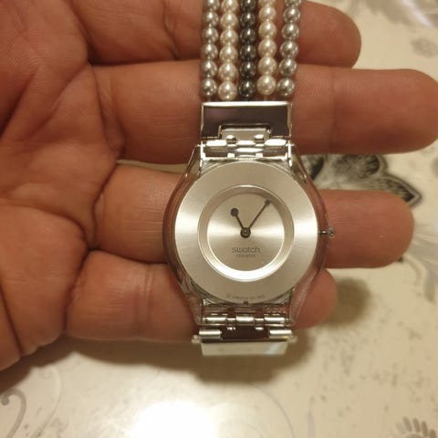 Swatch Aluminium unisex klocka med silverfärgad urtavla och mesharmband i metall. Klockan har tydliga siffror på urtavlan och är designad för att passa både män och kvinnor.