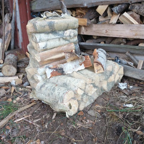 Nu-elda-säcken (tändkuber, späntved och finfin Björkved i en och samma påse- bara bära in och börja elda) 120 kr/säck